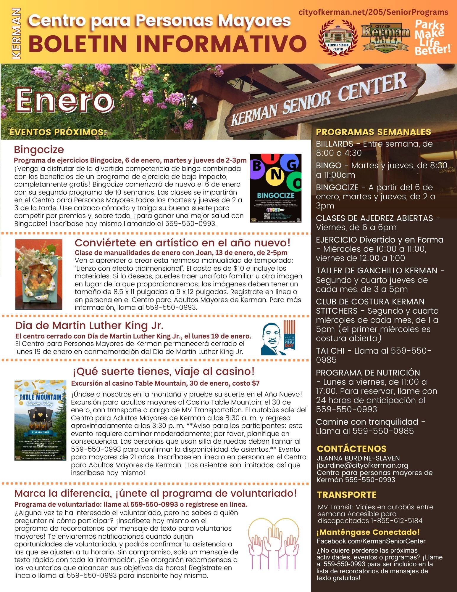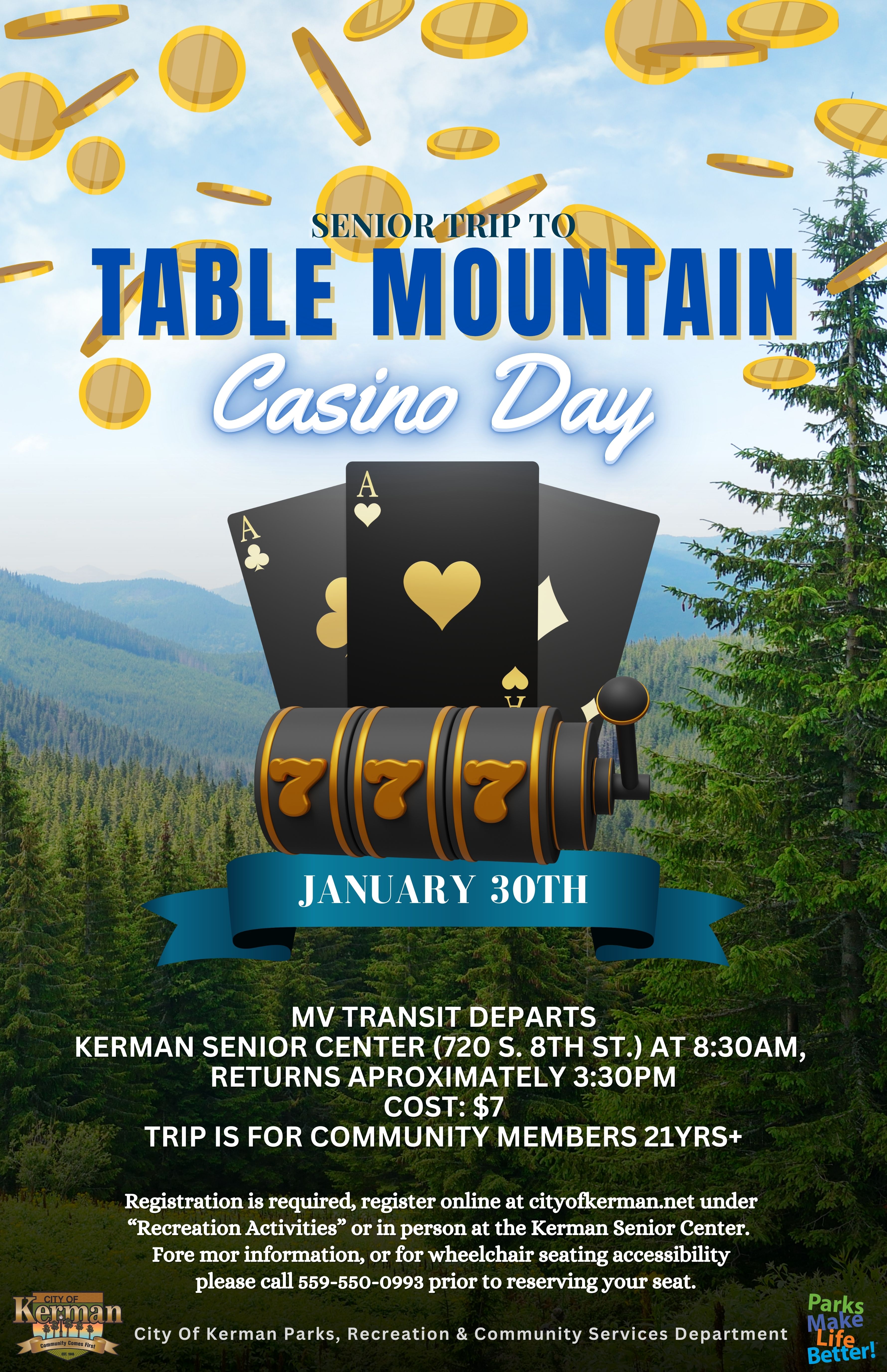 Join us for a day trip to Table Mountain Casino on Friday, January 30, 2026. Bus leaves the Kerman Senior Center at 8:30am and returns at approximately 3:30pm. Cost is $7.00. Seating is limited. Online Registration