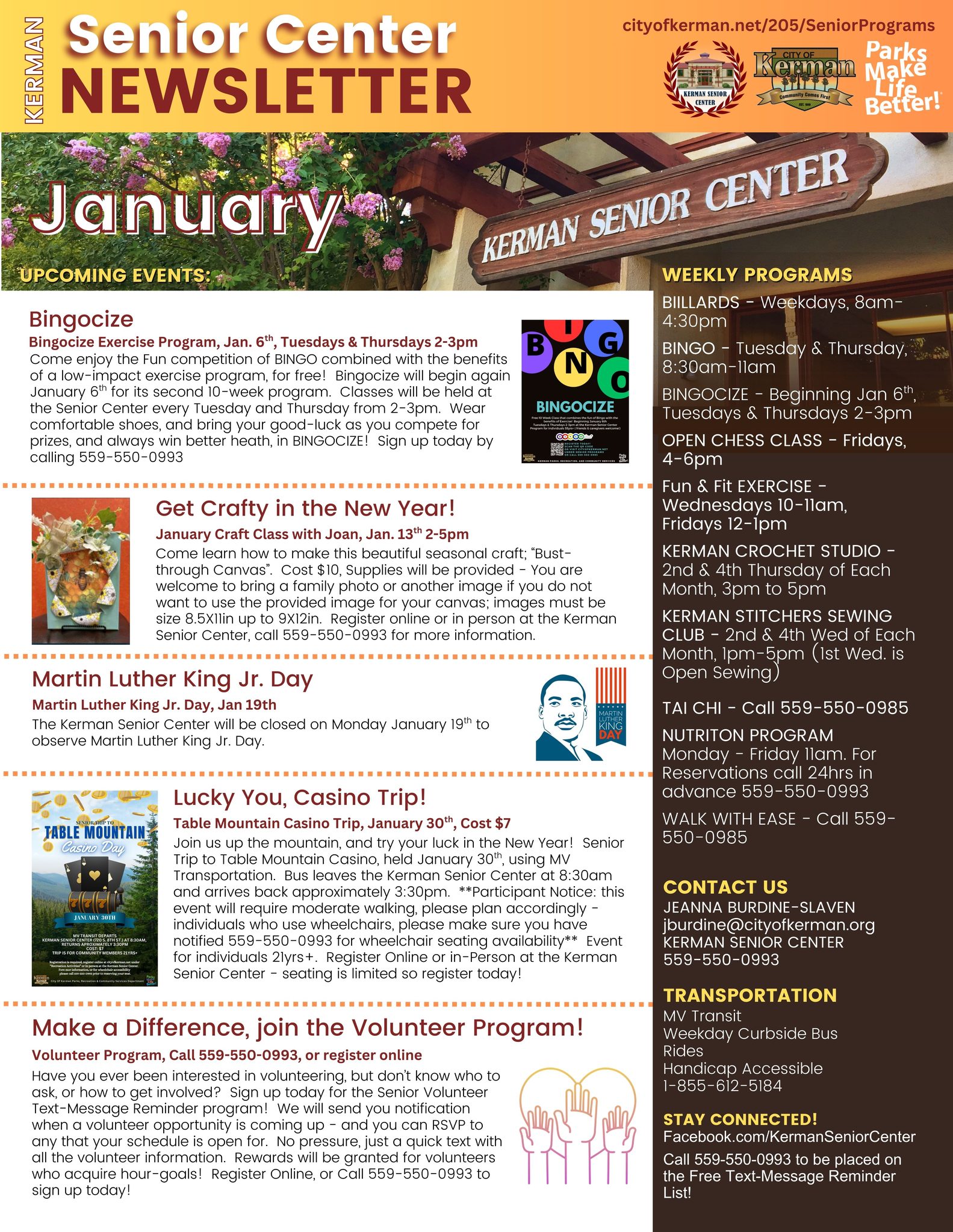 Check out the Monthly Kerman Senior Center Newsletter for updates about programming, events, daily activities, and more!