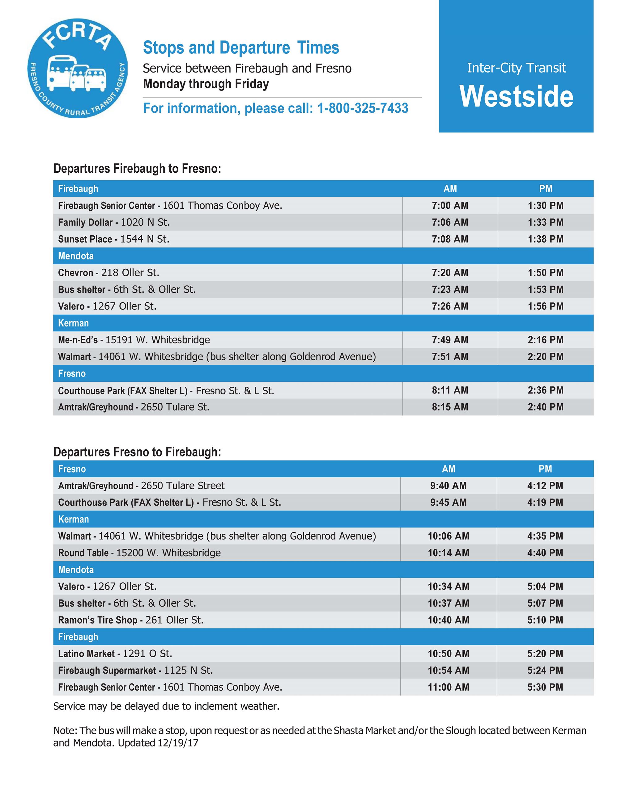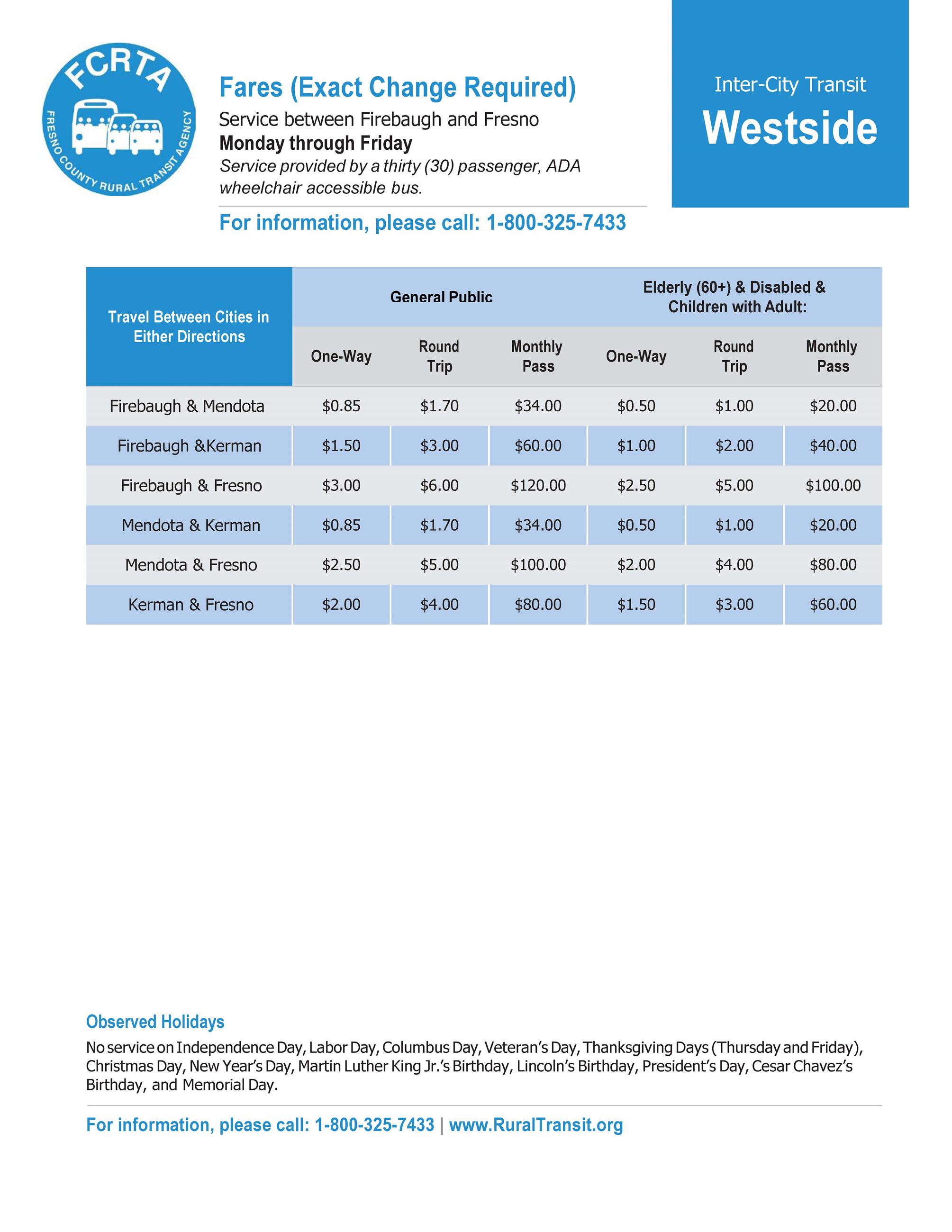 The Westside Transit (also known as the San Joaquin Transit) is provided to residents of the Fresno-Clovis Metropolitan Area; Monday through Saturday. It connects with the Fresno Area Express and KART in Downtown Fresno. It does not provide connection to any transit system north of Fresno County. Call 855-612-5184 to schedule service.