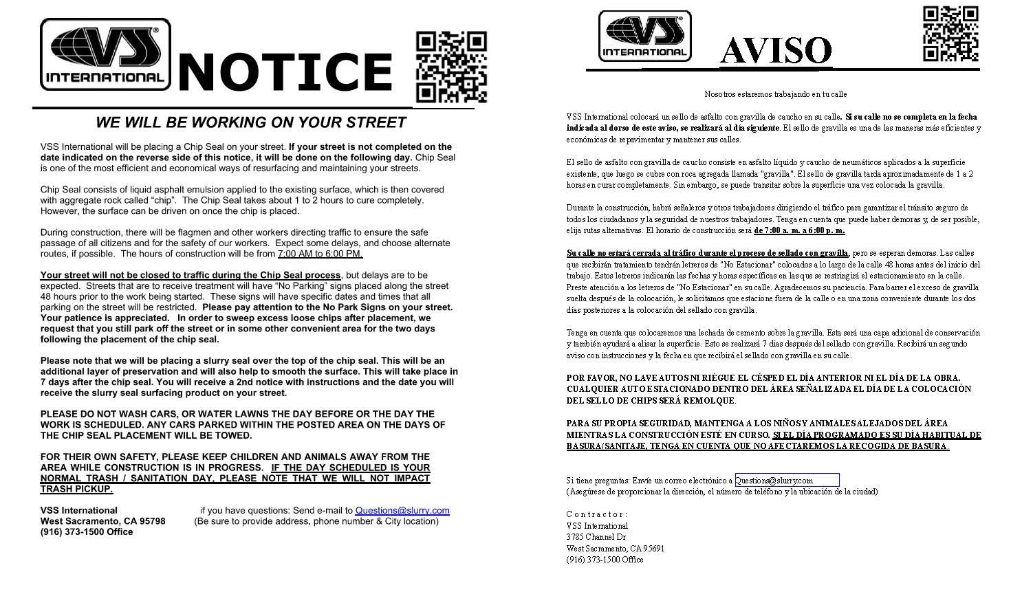 - Street Sealing Project - VSS International will begin street sealing work at various locations starting September 4, 2025, from 7:00 am to 5:00 pm. During construction, the residents are advised not to park along the street where 'no parking signs' will be posted. Please note that delivery trucks, garbage trucks, and emergency vehicles will have access during the construction period. For any construction-related questions, please call VSS International at (916) 373-1500. The Cape seal project is scheduled for October 10, 2025, at various locations. The slurry seal at these locations is scheduled to begin on October 13, 2025, and continue through October 16, 2025.
